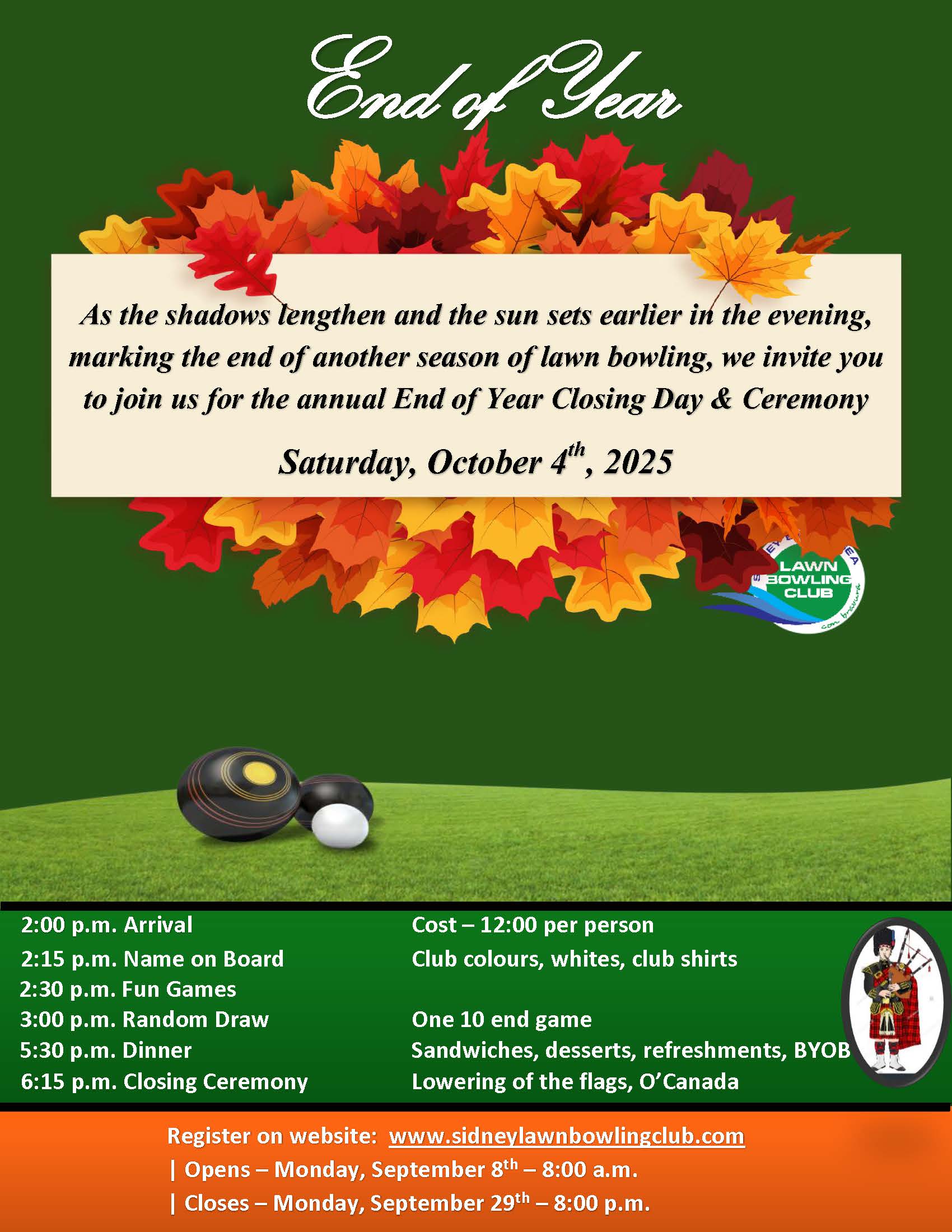 Please join us as we wind up and celebrate the end of the “official” season of bowling and special events. Maximum of 100 entries. The day will start with fun games, a 10 end random draw (if you are sharing a game, present both tags to the Drawmaster) followed by social time, a light dinner and will conclude with a special guest, lowering of the flags and singing O’Canada.