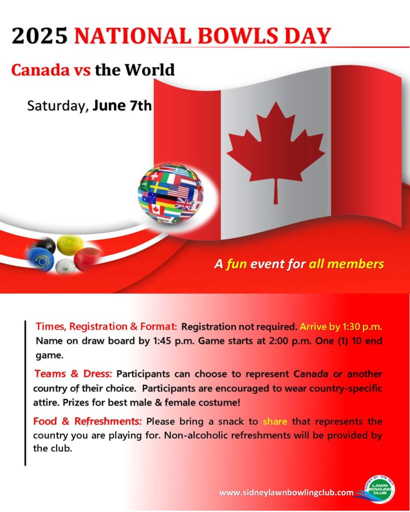 Celebrated annually in conjunction with Bowls Canada, the day is used to promote the sport of Lawn Bowling in the community. For a few years now we have chosen the theme Canada vs. the World. The event features national costumes, food and fun bowling.