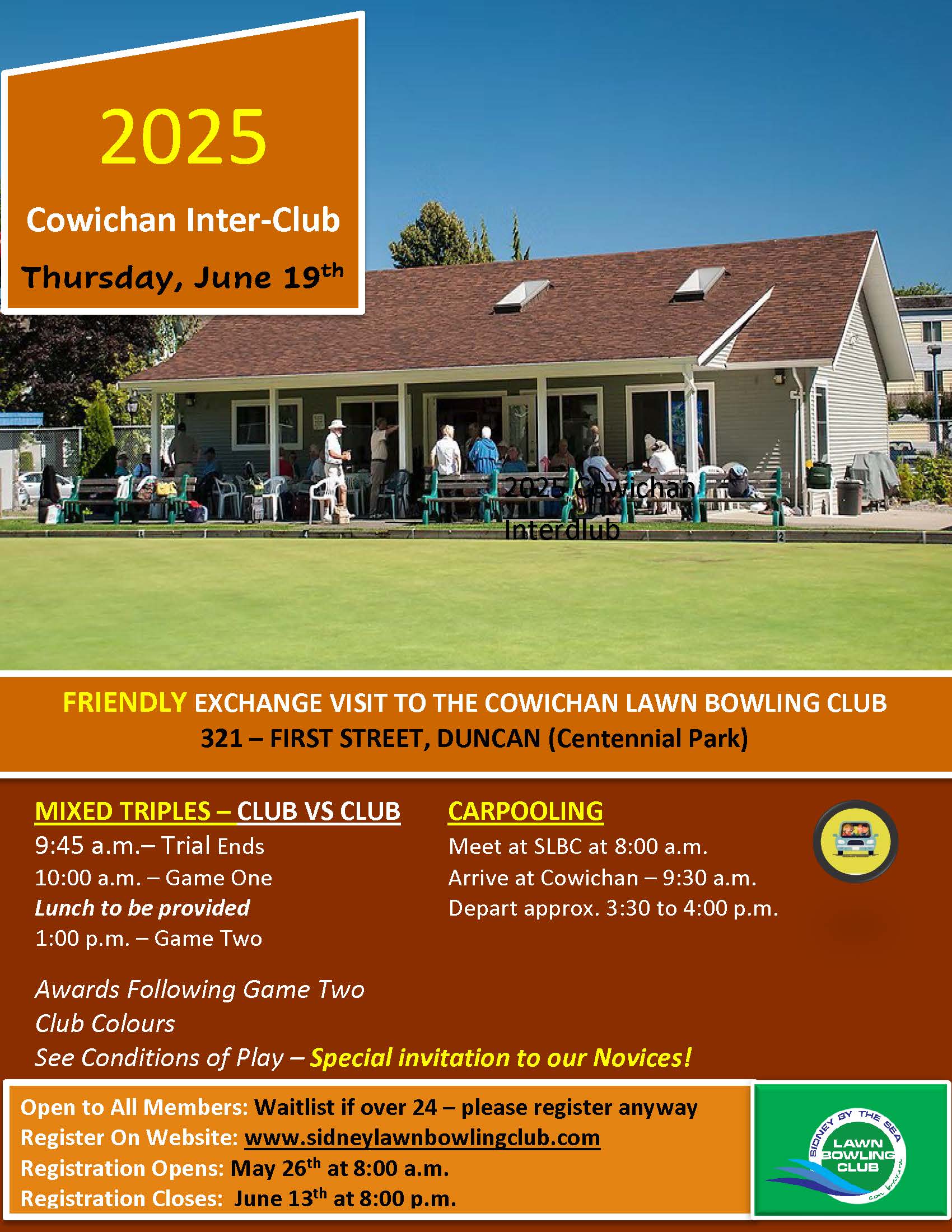 This year our annual exchange is hosted by the Cowichan Lawn Bowling club in Duncan. We will car pool to Duncan on June 19 for two mixed triples games. The Cowichan Club will kindly provide us with lunch between games. We will play for a lot of fun and for the coveted annual trophy. The Games Committee encourages our Novices to sign up for this “away” tournament. There is no fee for this event. Please refer to the Event Information for details.